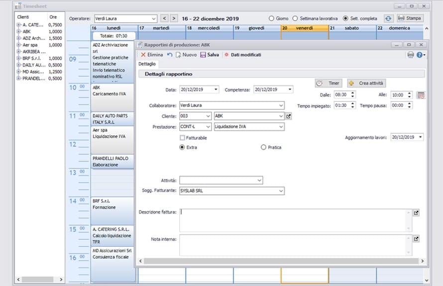 La funzionalità Time Sheet consente di visualizzare/inserire i rapportini in una tabella settimanale, potendo controllare il totale delle ore inserite per ogni giornata.