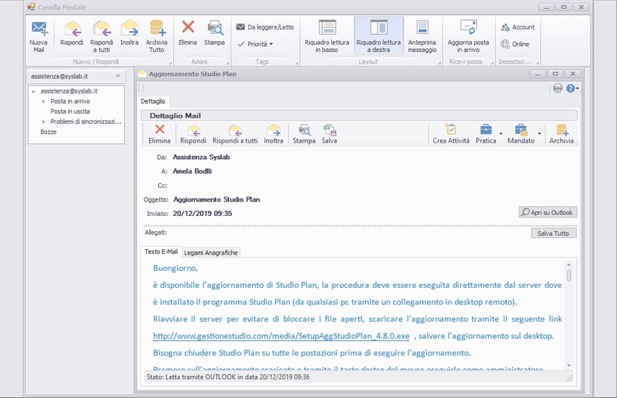 Tramite l’acquisizione delle e-mail scambiate, archivia automaticamente ogni messaggio con i relativi allegati sull’anagrafica collegata all’indirizzo di posta.
