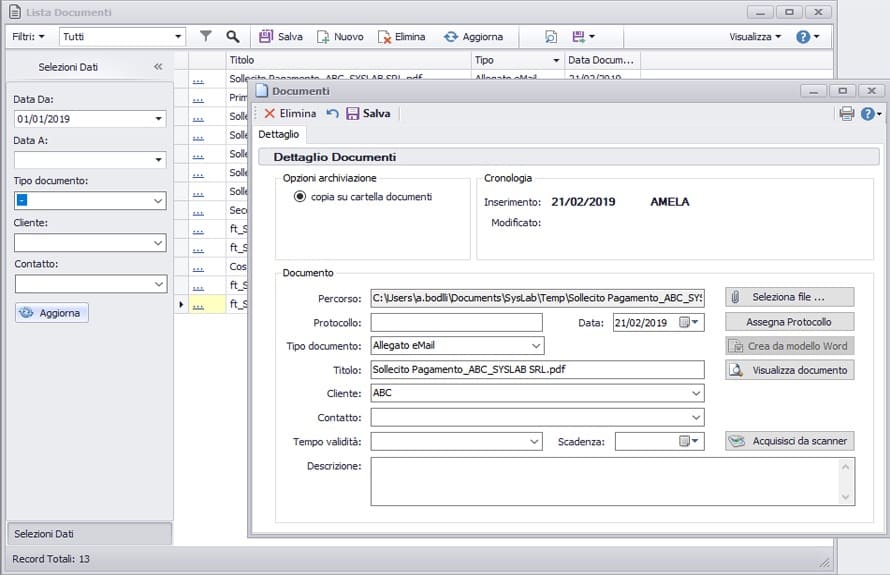 Archivia e organizza tutte le informazioni dei clienti come scadenze, documenti, email e rapportini delle telefonate importati dal centralino voip: ogni fatto archiviato e rintracciabile.