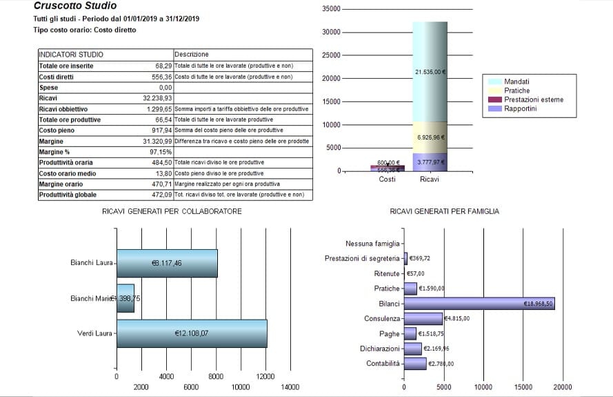 Vari report e tabelle pivot completamente personalizzabili consentono di analizzare i diversi indicatori dello studio, come budget e consuntivi, analisi del fatturato, marginalità dei clienti e delle aree d’affari e consuntivi collaboratori (tempi, produttività, carichi di lavoro).